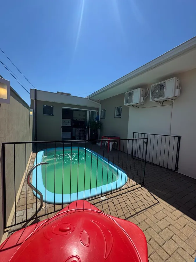 Quiosque com 11 m todo mobiliado com banheiro, piscina com aquecimento, cascata e led.